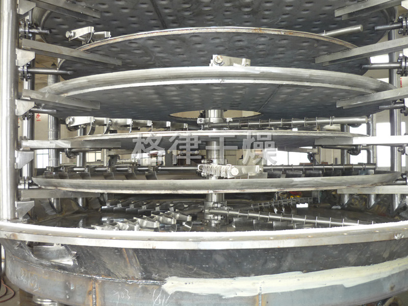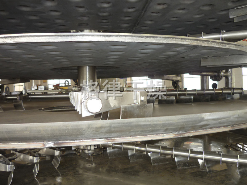 湿物料自加料器连续地加到干燥器上部第一层干燥盘上,带有耙叶的耙臂作回转运动使耙臂作回转运动使耙叶连续地翻抄物料。物料沿指数螺旋线流过干燥盘表面,在小干燥盘上的物料被移送到外缘,并在外缘落到下方的大干燥盘外缘,在大干盘上物料向里移动并从中间落料口落如下一层小干燥盘中。大小干燥盘上下交替排列,物料得以连续地流过整个干燥器。中空的干燥盘内通入加热介质,加热介质形式有饱和蒸汽、热水和导热油,加热介质由干燥盘的一端进入,从另一端导出。已干物料从最后一层干燥盘落到壳体的底层,最后被耙叶移送到出料口排出。湿份从物料中逸出,由设在顶盖上的排湿口排出,真空型盘式干燥器的湿气由设在顶盖上的真空泵口排出。从底层排出的干物料可直接包装。通过配加翅片加热器、溶剂回收冷凝器、袋式除尘器、干料返混机构、引风机等辅机,可提高其干燥的生产能力,干燥膏糊状和热敏性物 料,可方便地回收溶剂,并能进行热解和反应操作。